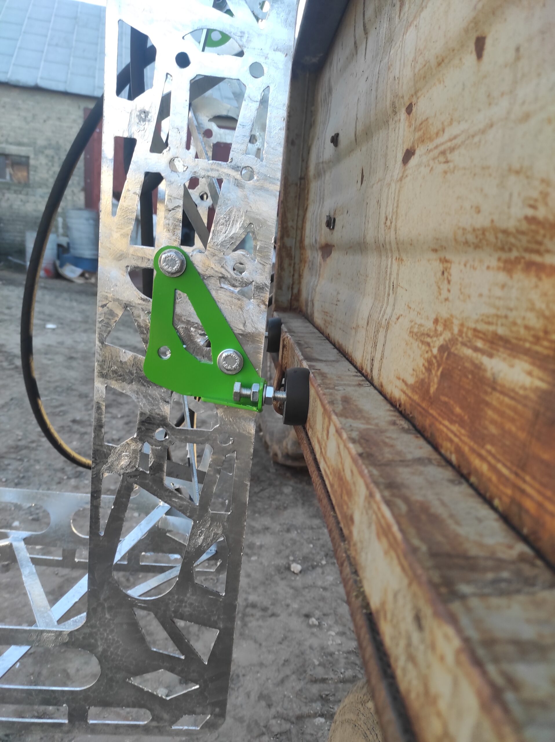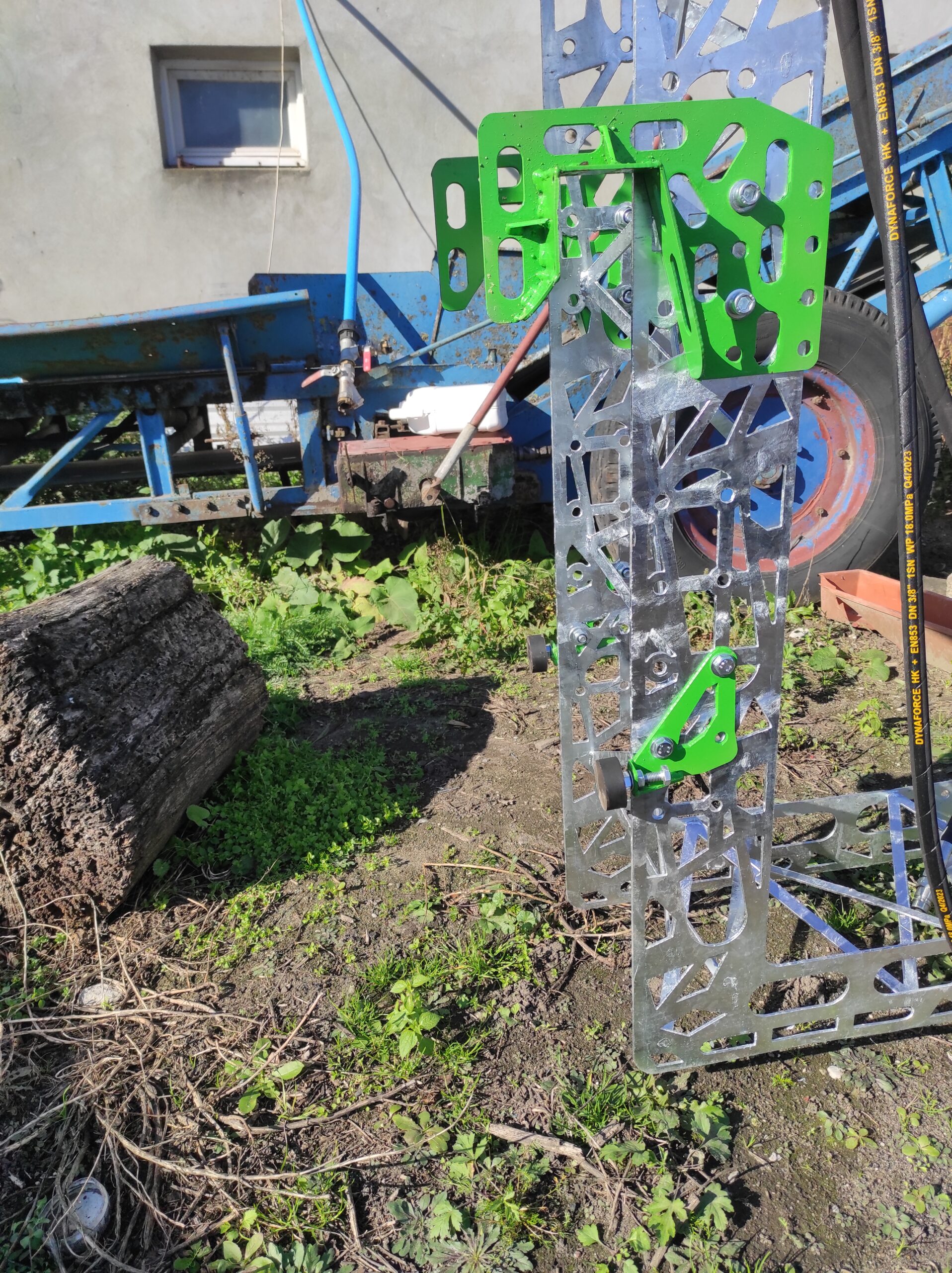 Zestaw haków i odbojów służących do zawieszenia taśmociągu na burcie przyczepy.